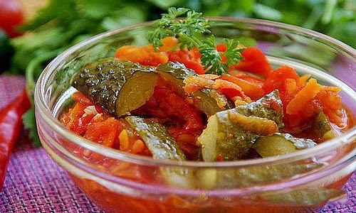 ЛЕЧО ИЗ ОГУРЦОВ НА ЗИМУ - невероятно вкусная заготовка!Ингредиенты:Томаты – 1,5 кг.;Перец сладкий – 300 гр.;Показать полностью…Огурцы – 2,5 кг.;Морковь – 300 гр.;Масло растительное – 0,5 стакана;Чеснок – 1 головка;Перец чили – 2 стручка;Уксус 9%– 100 мл.;Сахар – 0,5 стакана;Соль – 1 ст. ложка. Приготовление:Помидоры пропустим через мясорубку, желательно отрезав от них твердые места где крепится плодоножка. Так же пропустим через мясорубку горький перец чили и чеснок.Теперь берем красный болгарский перец нарежем ножом на тонкую соломку. Морковь натираем на крупную терку.Подошла очередь к огурцам. Нарезать огурцы будем сначала по всей длине на четыре части, а потом еще на несколько частей. Размер огурцов в нарезанном виде должны быть не более 5 сантиметров. Огурцы должны быть не горькие, если шкурка огурчиков горькая, очистить огурец от нее.Затем морковь и болгарский перец слегка обжариваем на маленьком огне в сковородке примерно 10 минут.Затем берем достаточно большую кастрюлю с толстым дном, наливаем туда перекрученные томаты, засыпаем перец с морковкой и добавляем огурцы. Солим, добавляем сахар и хорошо перемешиваем. Наливаем масло и ставим на огонь.Когда салат закипит, уменьшаем огонь до минимума и варим около тридцати минут, при этом время от времени перемешиваем салатик.За 5-10 минут до готовности наливаем уксус.Готовый салат разливаем в стерилизованные банки, закатываем и укутываем теплым одеялом.